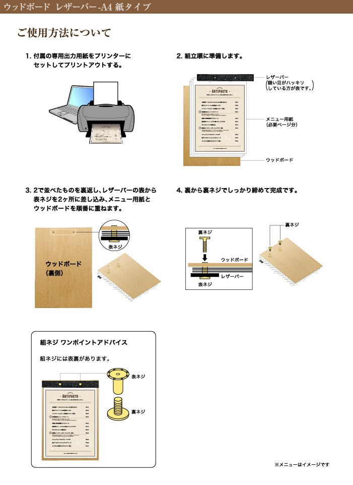 | 【洋風/和風】木製 おしゃれ メニューブック ウッドボード-レザーバー 紙タイプ:¥3,740 [税込] /ウッドボード-レザーバー 紙タイプ【A4】1セット |